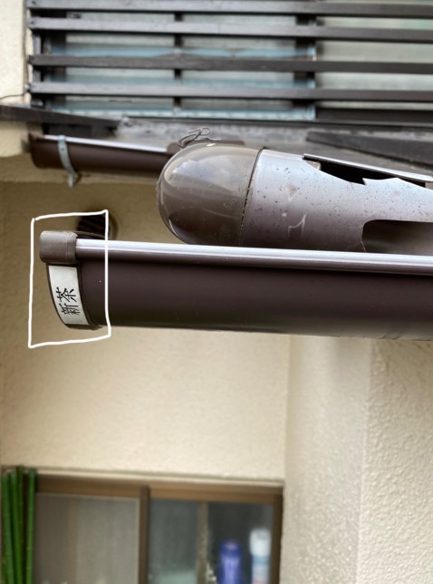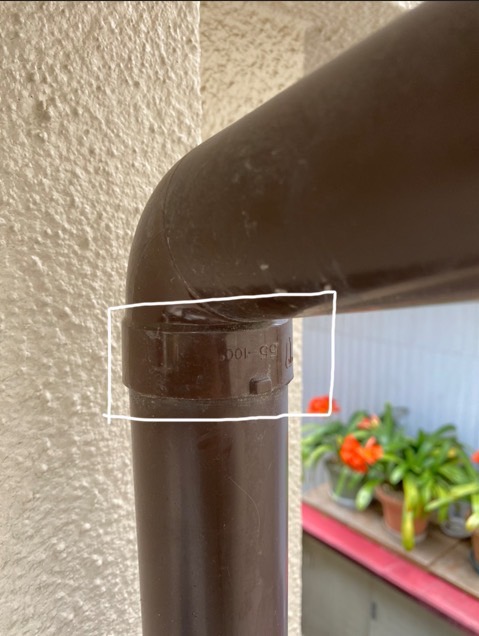 白線で囲った部位にはL 型継ぎ手(通称エルボ)が逆さについております。この施工では竪樋から水が漏れてしまいます。